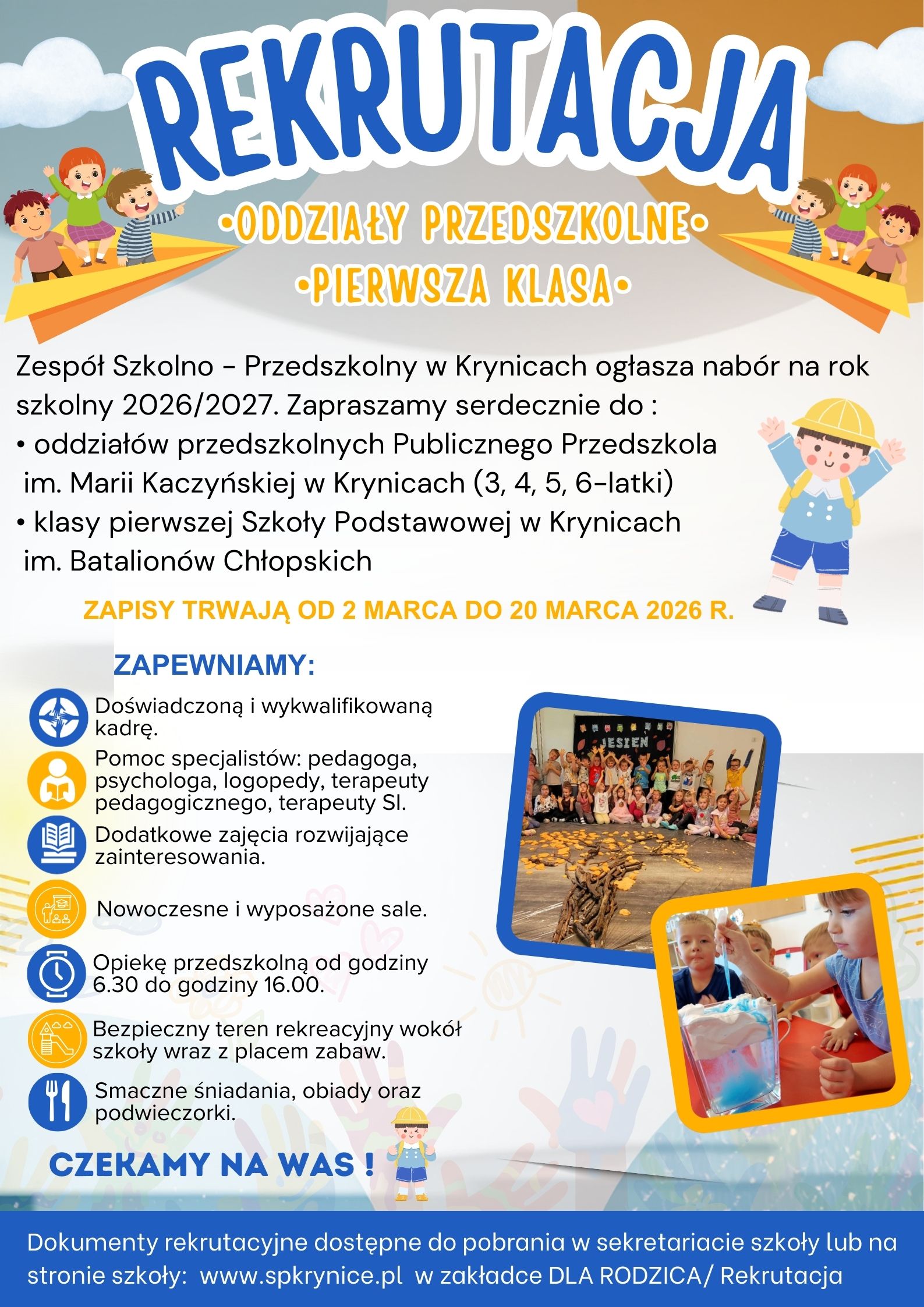 Informujemy, że w Zespole Szkolno- Przedszkolnym w Krynicach od 2 marca 2026 r. rozpoczyna się rekrutacja na rok szkolny 2026/2027 do:
