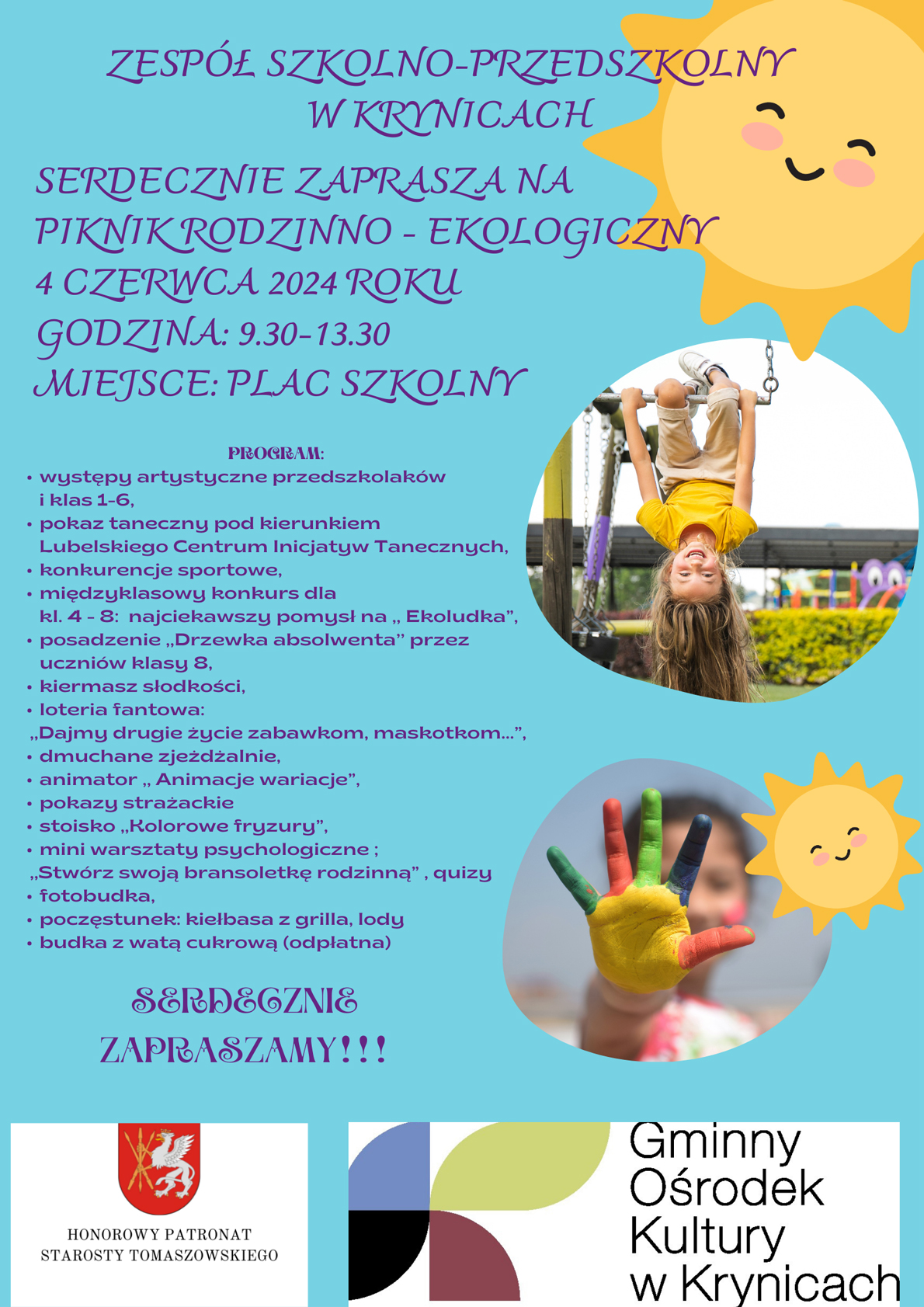 4 czerwca 2024 r. w naszej szkole odbył się Piknik Rodzinno – Ekologiczny pod honorowym patronatem Starosty Tomaszowskiego oraz Gminnego Ośrodka Kultury w Krynicach. Na uroczystość przybyli zaproszeni goście: członek zarządu Rady Powiatu w Tomaszowie Lubelskim Dariusz Czop, przedstawiciele Rady Gminy: wójt gminy Krynice Jacek Wiśniewski, skarbnik Sylwia Pitura, radny Rady Gminy Janusz Iskierka, kierownik Gminnego Ośrodka Kultury w Krynicach Joanna Jamroż oraz pani Beata Gałan - Smól , a także przedstawiciele Rady Rodziców pani Stanisława Bosiak i pani Jagoda Karbowniczek oraz nasi uczniowie, przedszkolaki, rodzice i mieszkańcy Gminy Krynice.